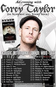 The idea for the tour sprang from an intimate set of UK gigs that Taylor recently played to launch his bestselling book Seven Deadly Sins, as well as his speaking engagement at Oxford University this summer. Taylor will perform originals and some choice covers acoustically; will read selections from the book; and take questions from the audience. Billed as “An Evening With Corey Taylor,” these shows will be a rare opportunity for many fans to interact with Taylor in this intimate a setting, and vice versa.